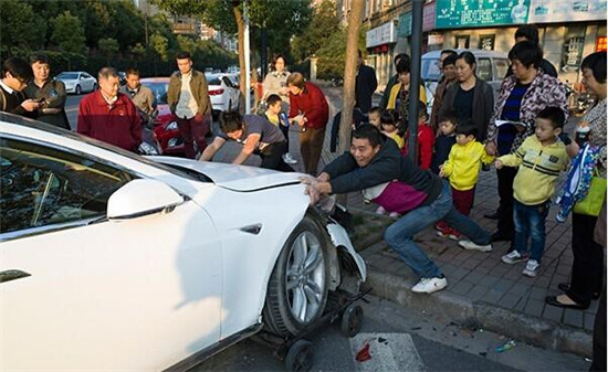 特斯拉被撞,司机后来离开了现场,来了拖车人员。可是拖车人员挠头了,这特斯拉毕竟少见,怎么拖啊。