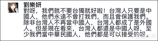 但也有台湾网民不以为意。刘乐妍为台湾前女F4团长,自从近年转往发展,常发表亲中言论。她曾经,“我是台湾人也是中国人,这个问题没有必要拿出来对立”。